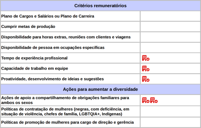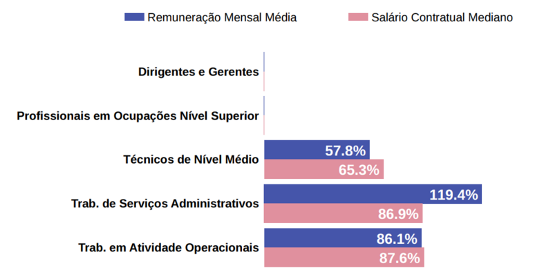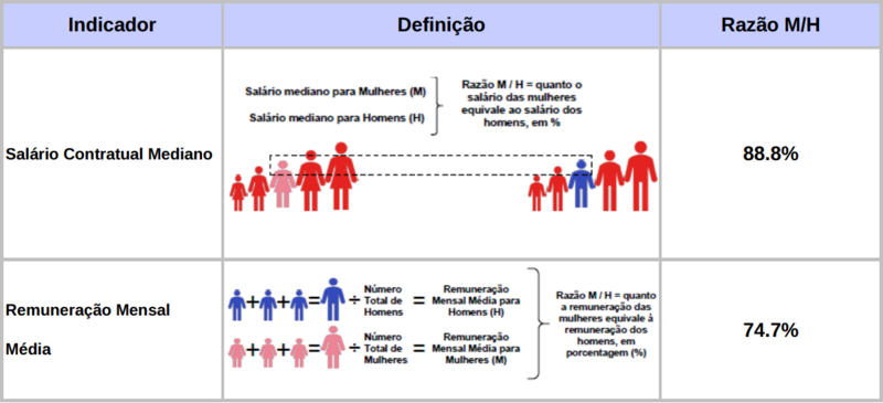 Diferença salarial entre mulheres e homens: O salário contratual mediano das mulheres equivale a 88.8% do recebido pelos homens. A remuneração média mensal das mulheres equivale a 74.7% da recebida pelos homens.